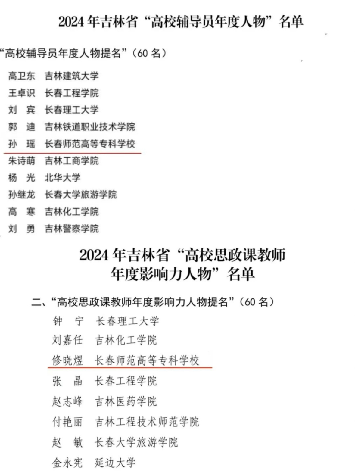 近日,吉林省教育厅组织开展2024年吉林省“高校思政课教师年度影响力人物”推选展示活动。经学校推荐、省教育厅专家评审等环节,我校思政部教师修晓煜老师获得吉林省“高校思政课教师年度影响力人物提名”,特殊教育学院孙瑶老师获得吉林省“高校辅导员年度人物提名”。