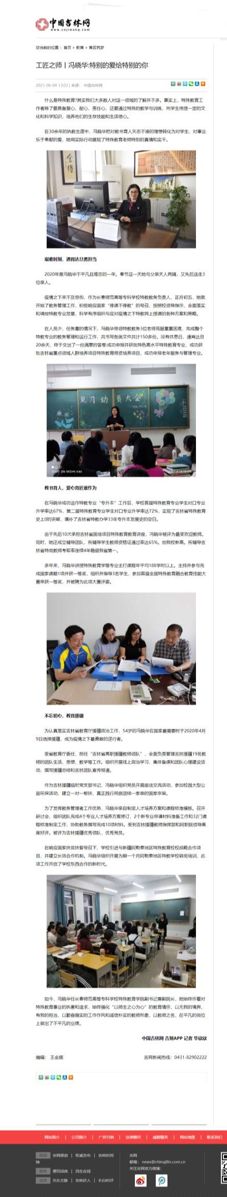 在30余年的执教生涯中,冯晓华把对教书育人矢志不渝的理想转化为对学生、对事业乐于奉献的爱,她用实际行动展现了特殊教育老师特别的真情和实干。